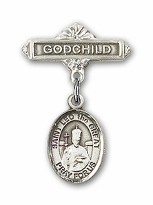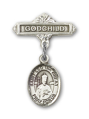 Sterling Silver Baby Badge with St. Leo the Great Charm and Godchild Badge Pin