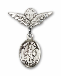Sterling Silver Baby Badge with St. Walter of Pontnoise Charm and Angel w/Wings Badge Pin